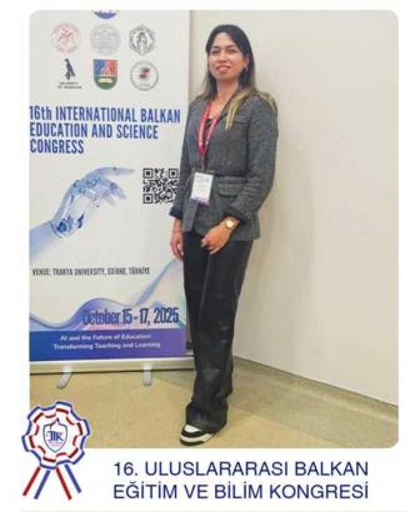 Jale Tezer Bilim Fen Ortaokulu Çayyolu Yerleşkesi Fen Bilimleri öğretmenimiz Ecem Balı, Trakya Üniversitesi Balkan Yerleşkesi ev sahipliğinde düzenlenen 16. Uluslararası Balkan Eğitim ve Bilim Kongresi (IBES 2025)’nde, üstün yetenekli öğrencilerle yürüttüğü araştırmayı başarıyla sunarak bizleri bir kez daha gururlandırdı!